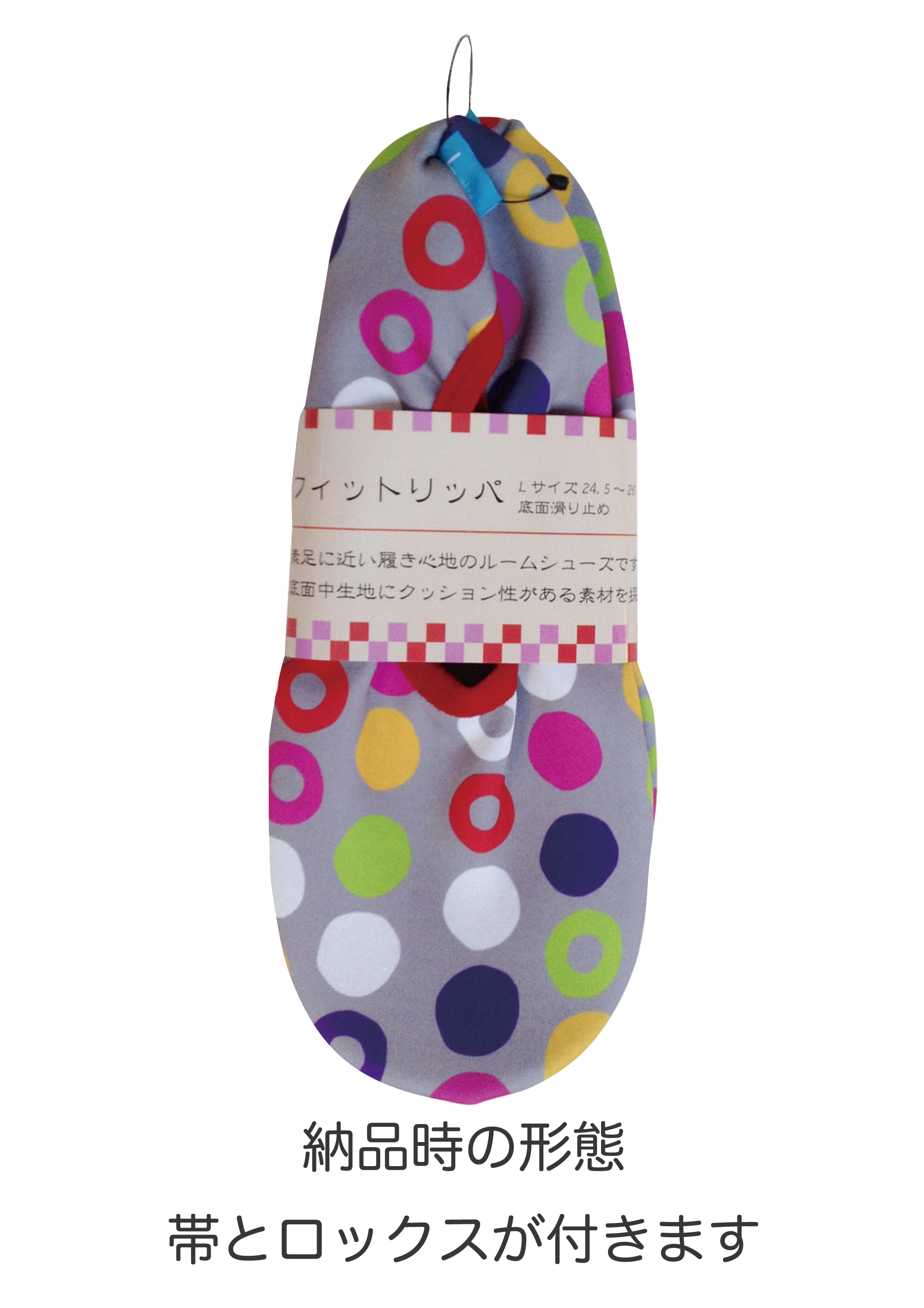 納品形態は、帯仕様に、サイズタグ部分にロックスを取り付けております。