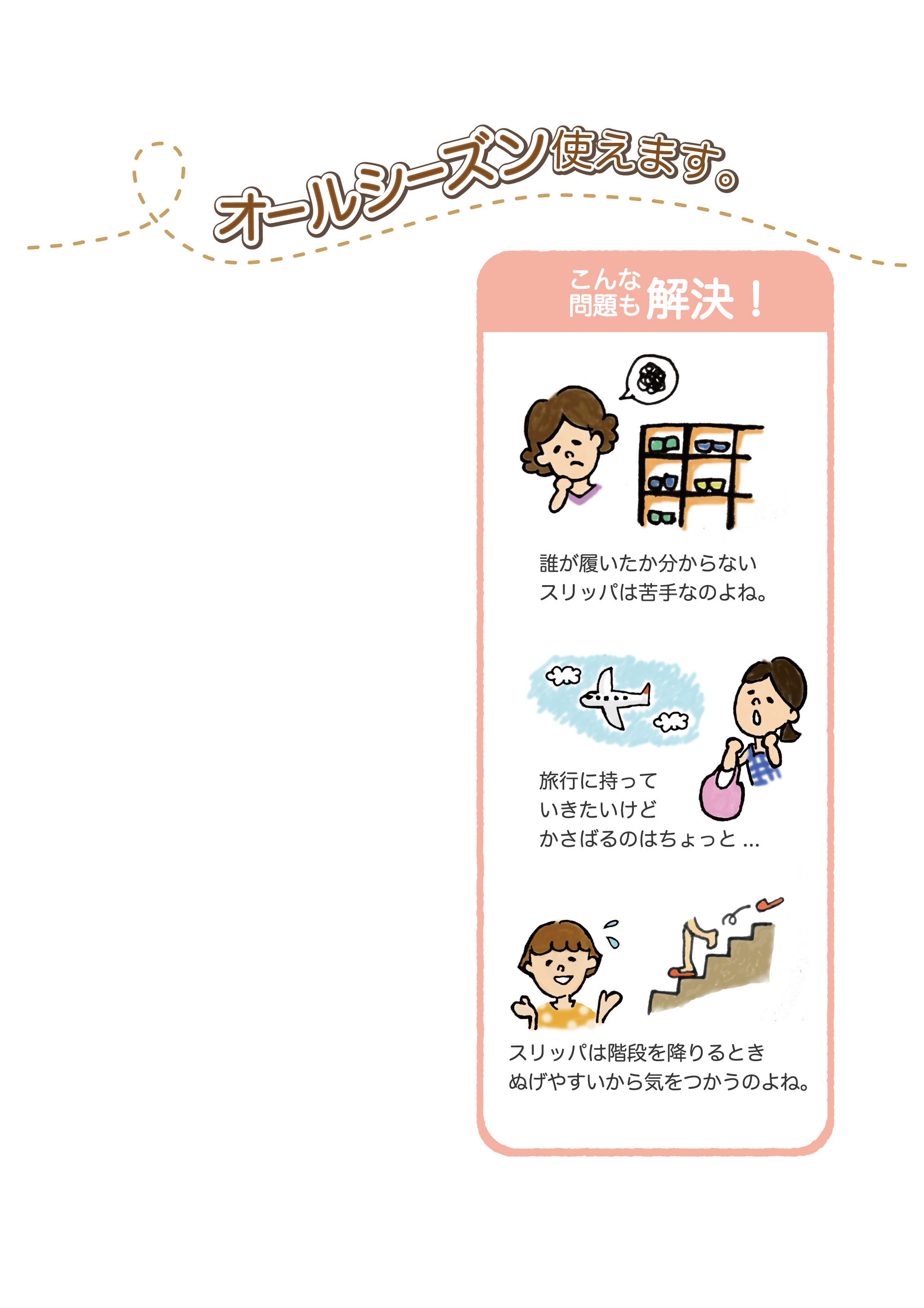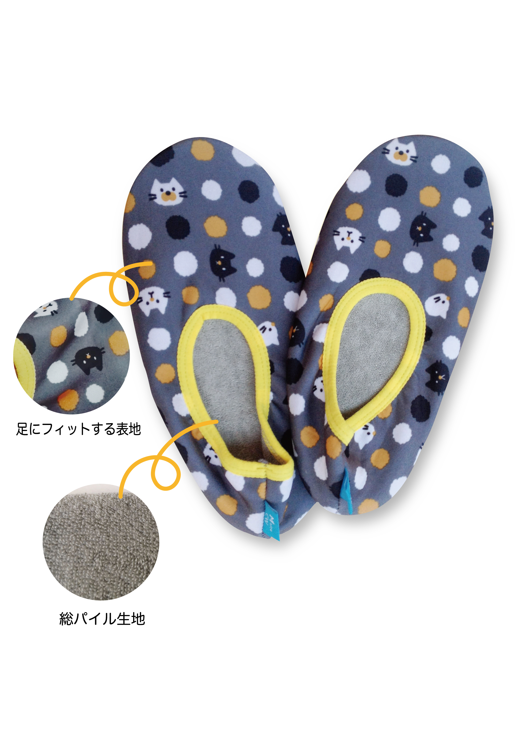 ルームシューズやヘルパーシューズとしてだけではなく、旅行先のホテルや飛行機内でも活躍できる仕様です。